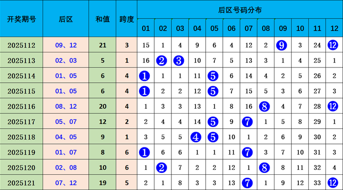 后离别析:上期开出07 12,近10期012路比为5 7 8;空洞分析,0路出码较少,本期后区预测0路出码上风,后区两码空洞参考:06 12.