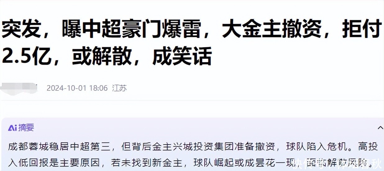 曝中超朱门爆雷!金主撤资拒付2.5亿,俱乐部或甩手,仅升超3年