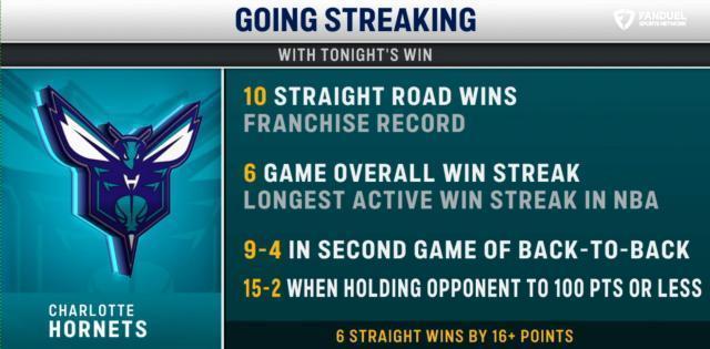 值得一提的是,这是黄蜂背靠背第二晚的比赛,至此,他们本赛季背靠背第二晚的战绩照旧是9胜4负。与此同期,黄蜂通顺第10场客场比赛取胜,创造了队史记录。另外值得一提的是,往常6连胜时刻,黄蜂扫数赢敌手至少15分,上一支能作念到这少量的球队如故2017-18赛季的英豪。